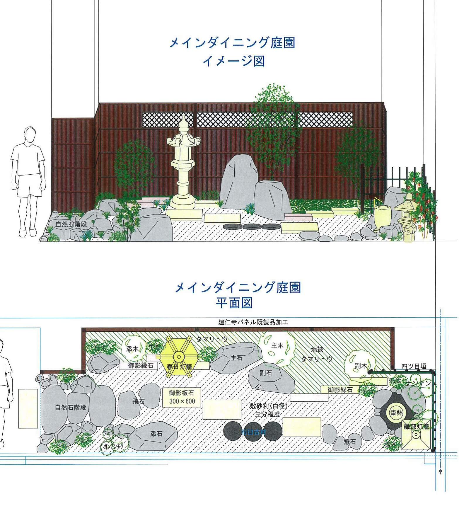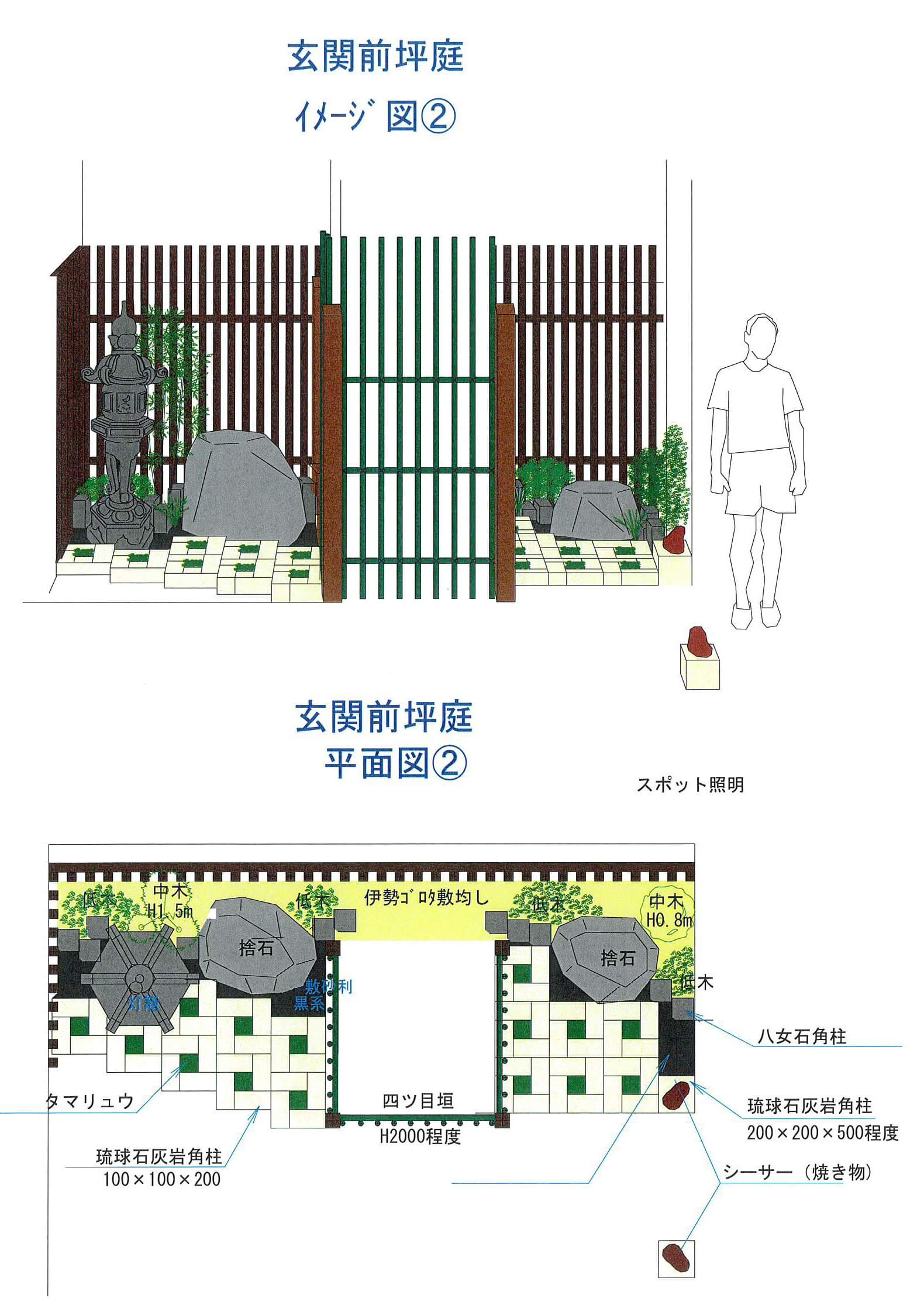 メインダイニング側と玄関前の坪庭を提案いたしました。