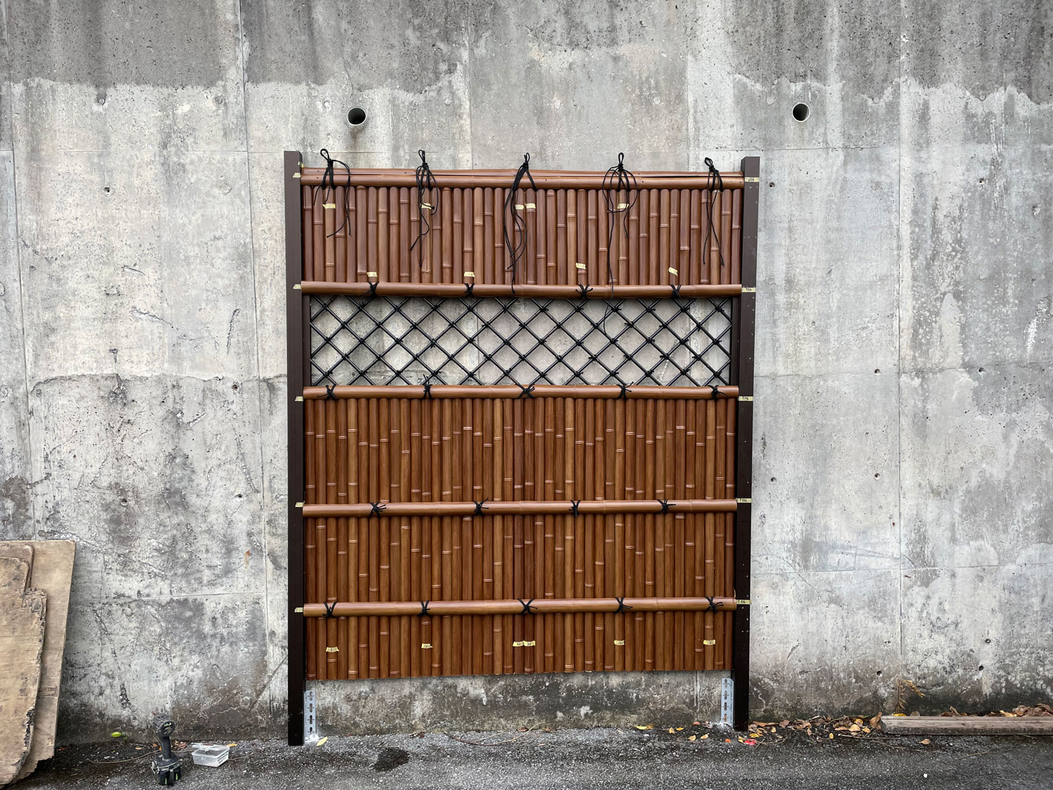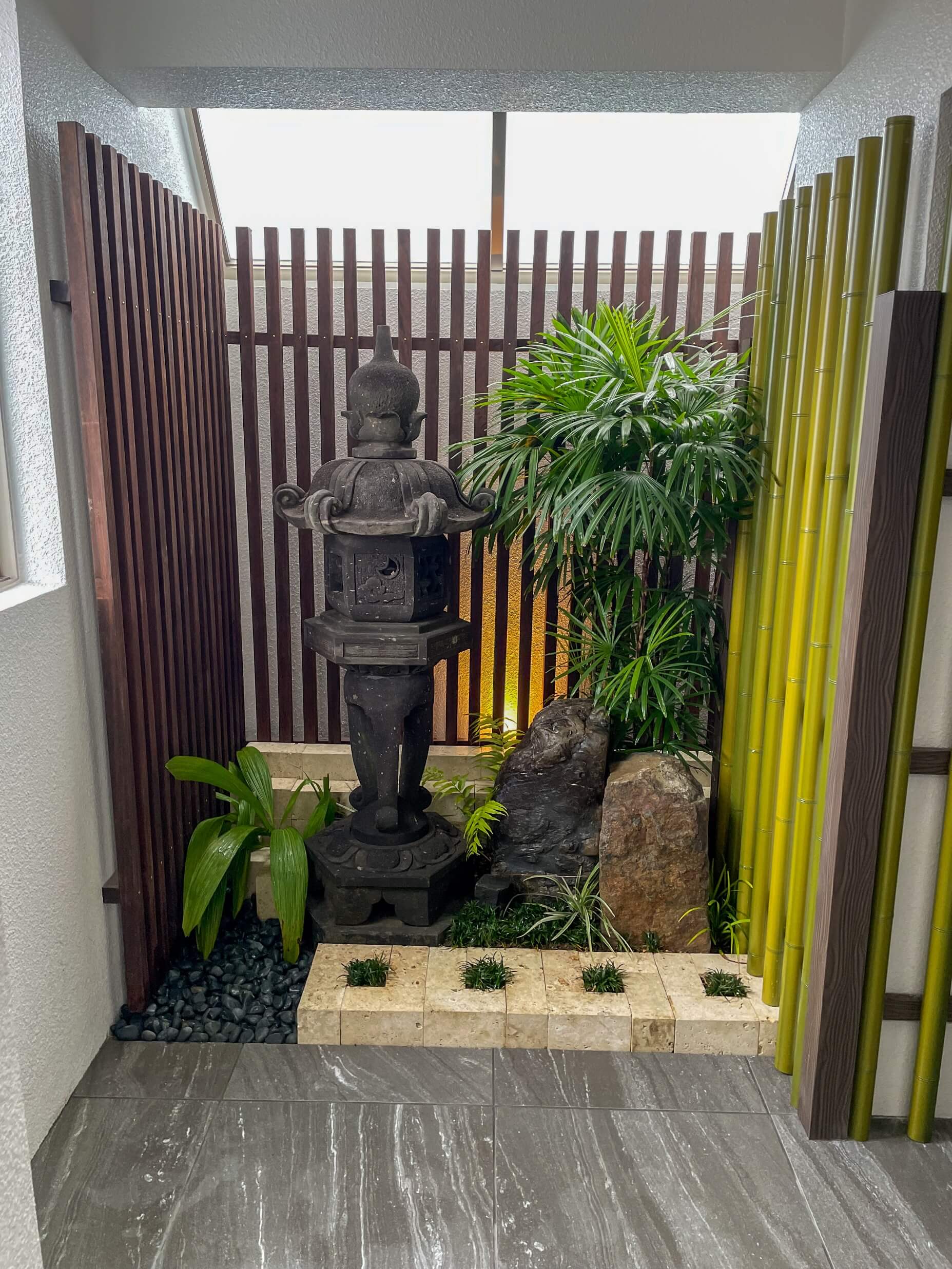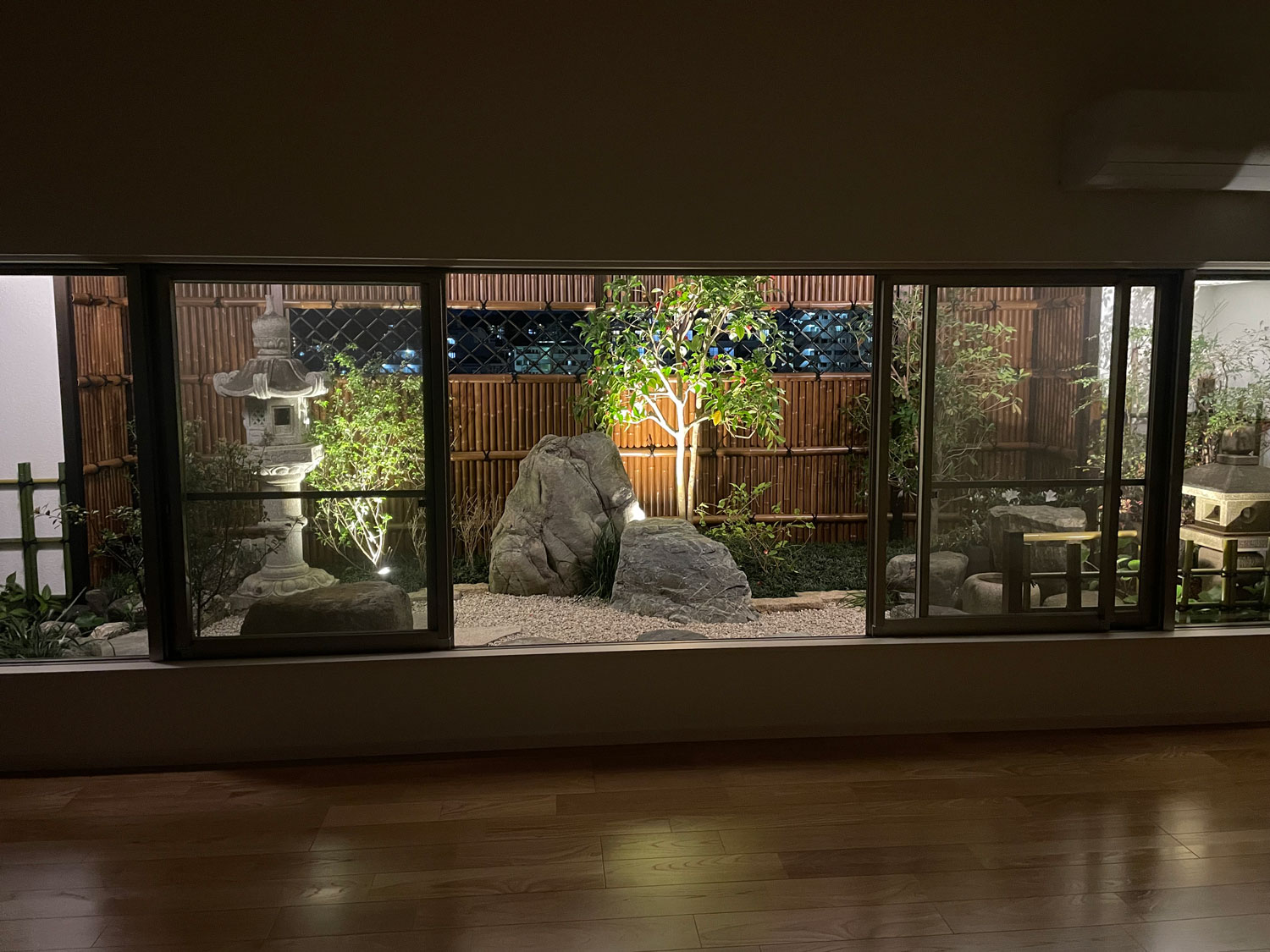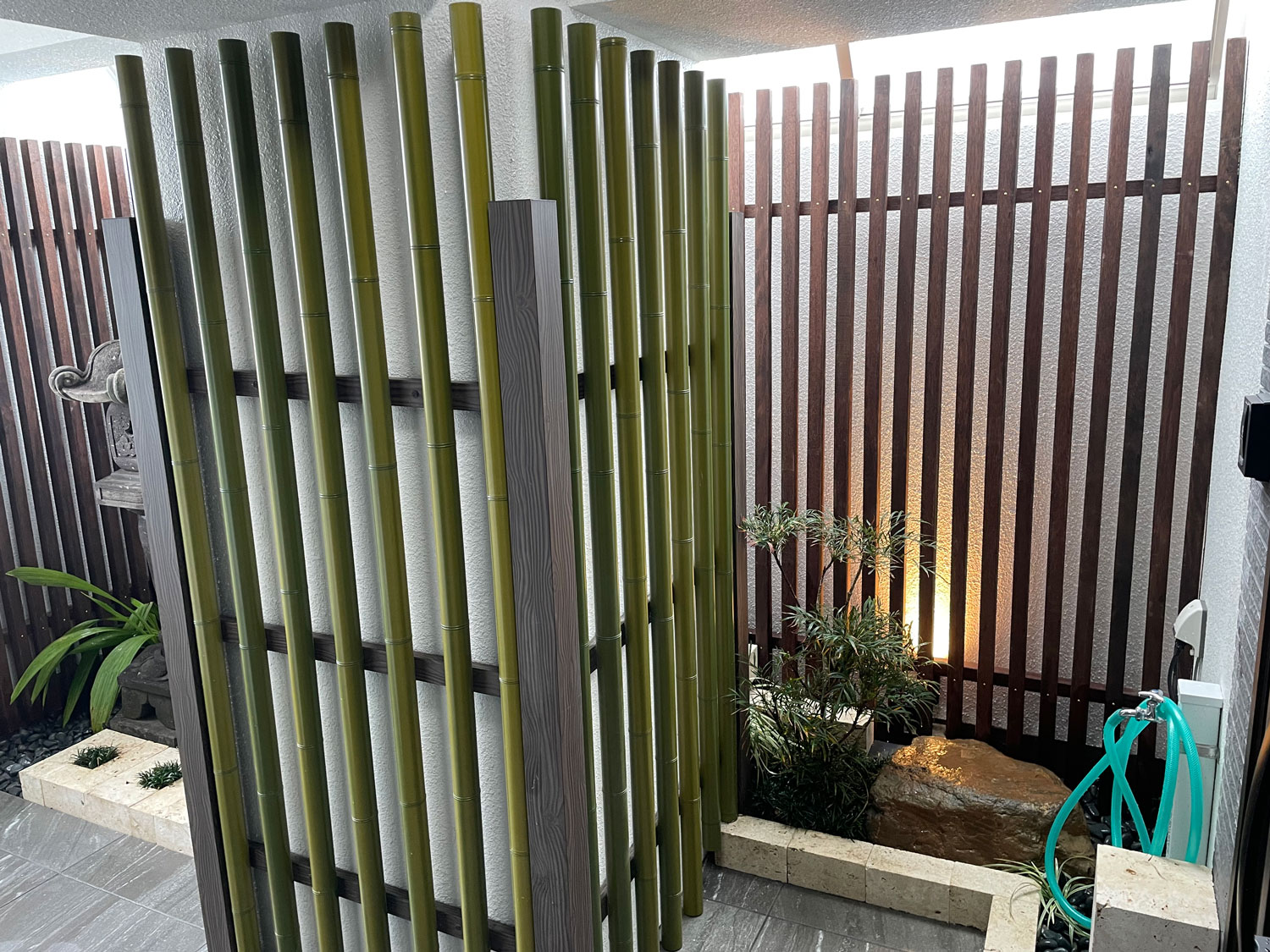 石組みや灯籠、植栽を浮き立たせるために、壁面を煤竹加工の人工竹垣で囲み、一部青竹の垣根を取り入れ一色単にならないように、また壁面の開口部から景色が見えるコンクリート躯体を利用し、遮蔽垣に欄間を取り入れ、透かして景色が見えるように工夫しました。