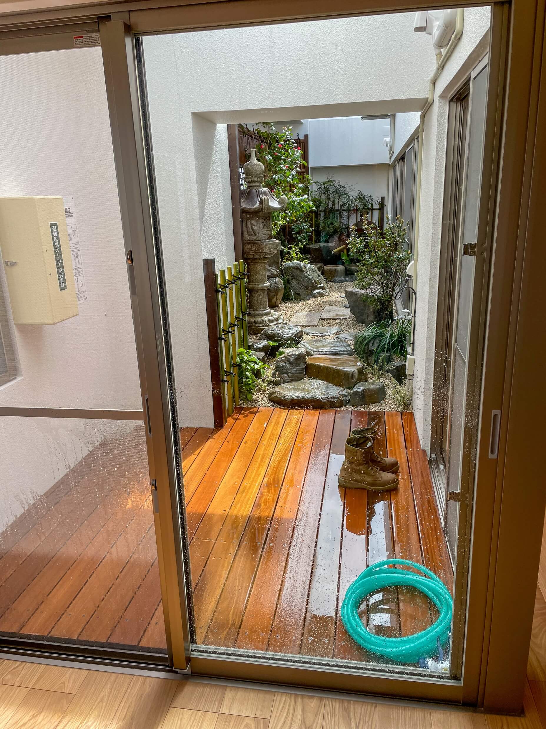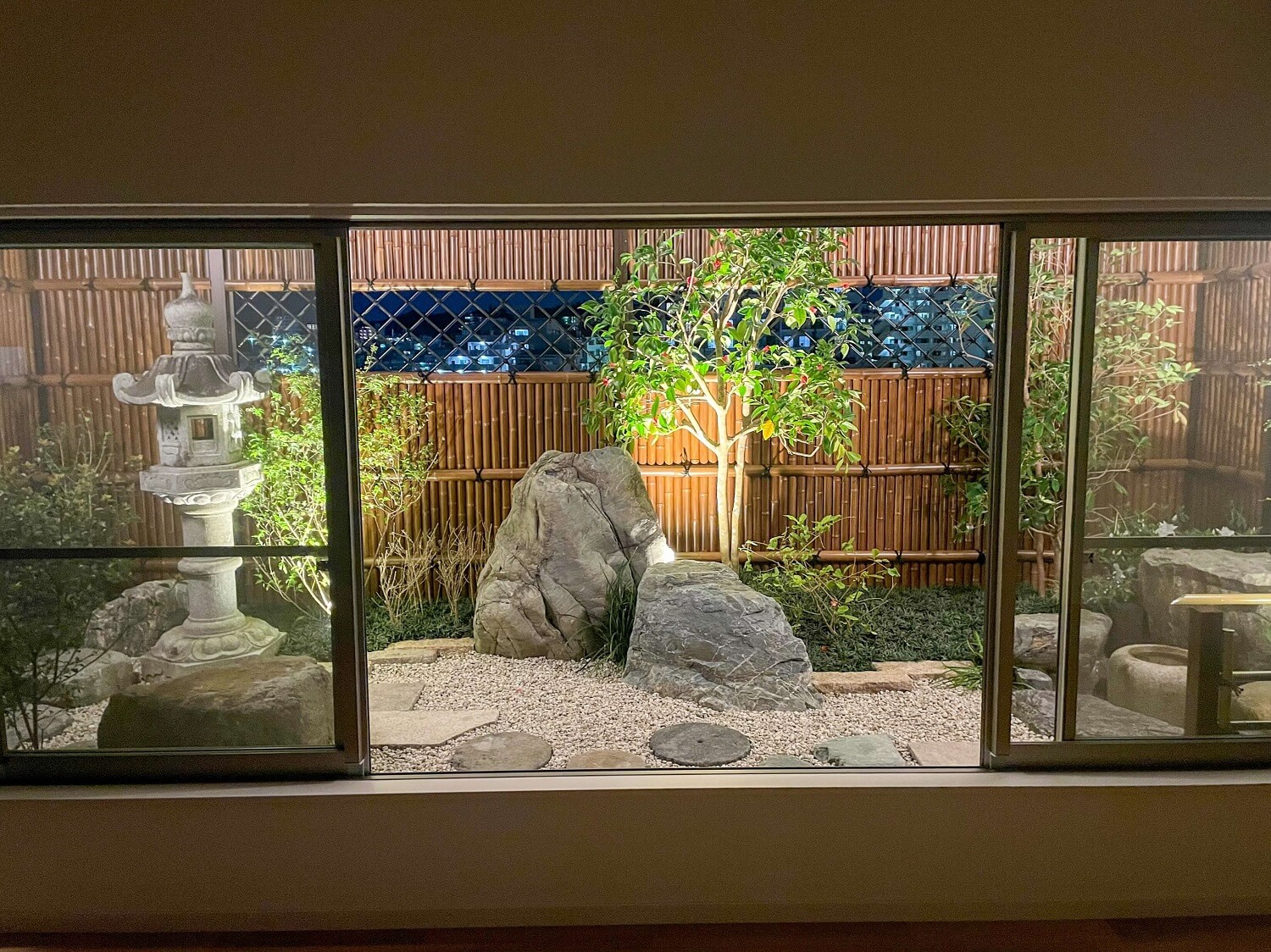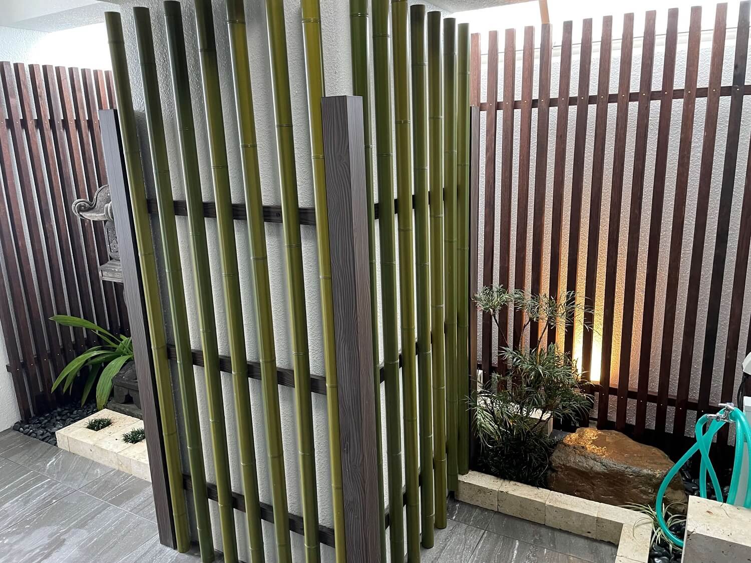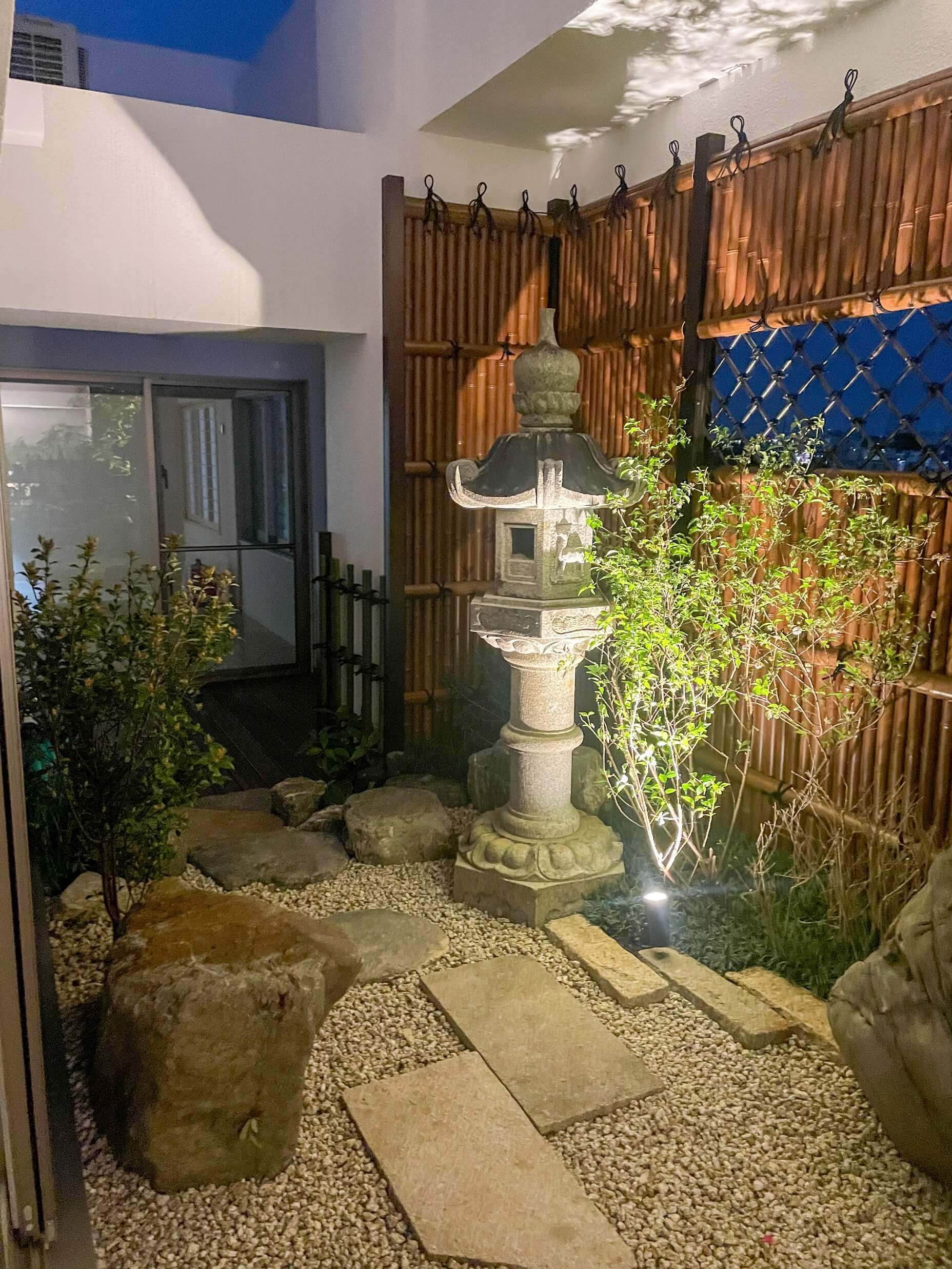 石組みや灯籠、植栽を浮き立たせるために、壁面を煤竹加工の人工竹垣で囲み、一部青竹の垣根を取り入れ一色単にならないように、また壁面の開口部から景色が見えるコンクリート躯体を利用し、遮蔽垣に欄間を取り入れ、透かして景色が見えるように工夫しました。