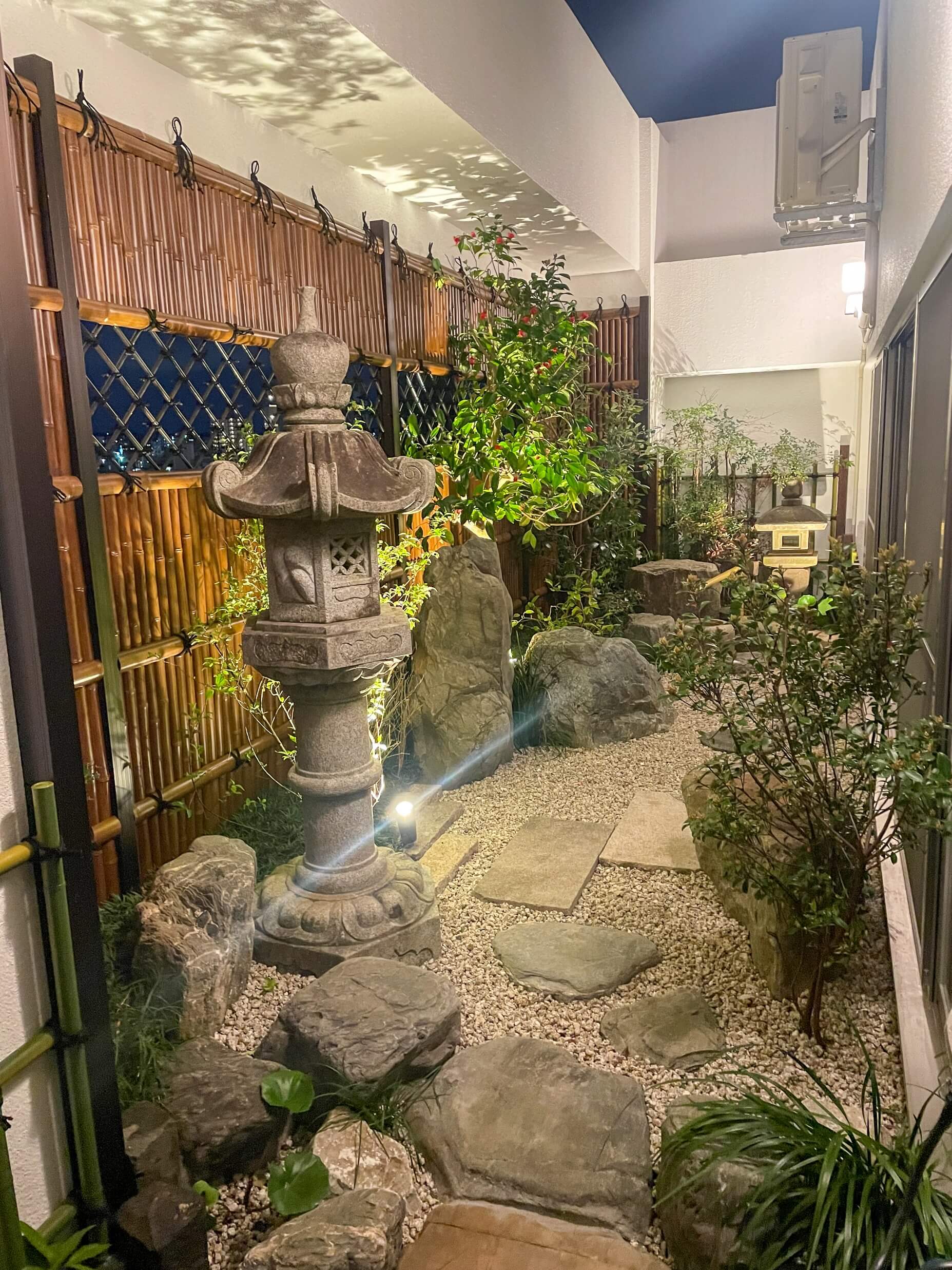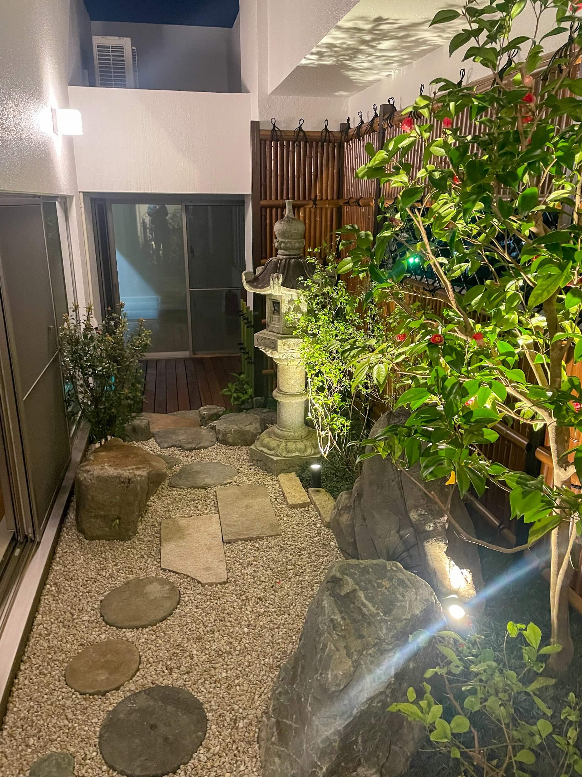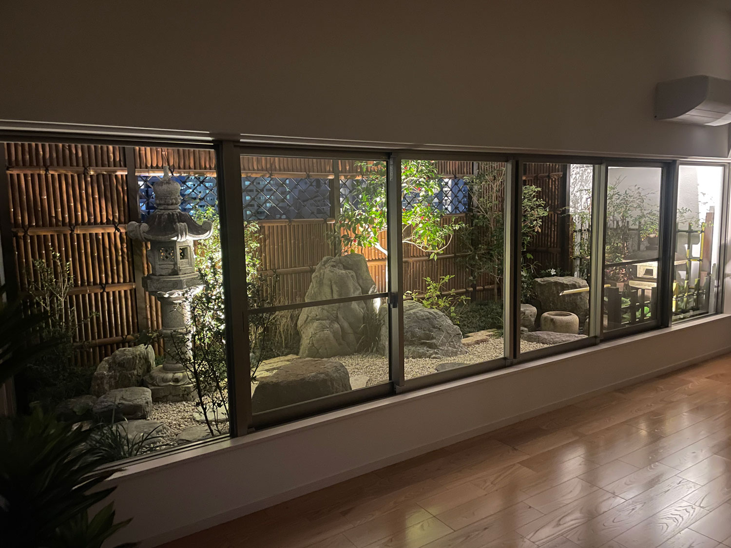 灯籠や木々の影が梁に写り、風でそよぐ様で涼を感じれるよう照明配置にしました。