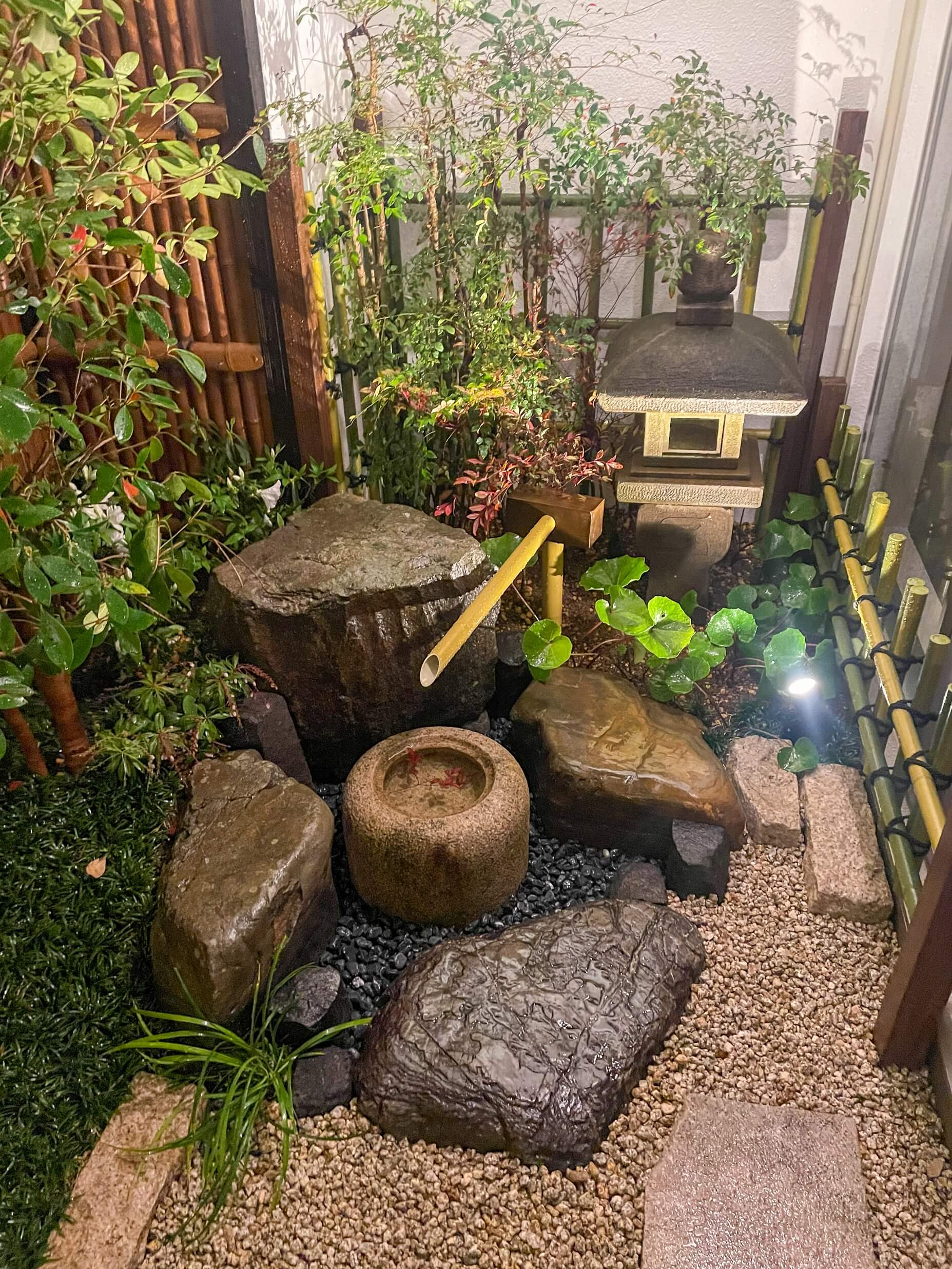 空間を生かすために密と隙のバランスを考慮し、枯山水に映える石組みを中心に、蹲を取り入れ、灯籠で、趣きを出しそれを際立たせる植栽になるように配置や色使いを勘案しながらデザインしました。