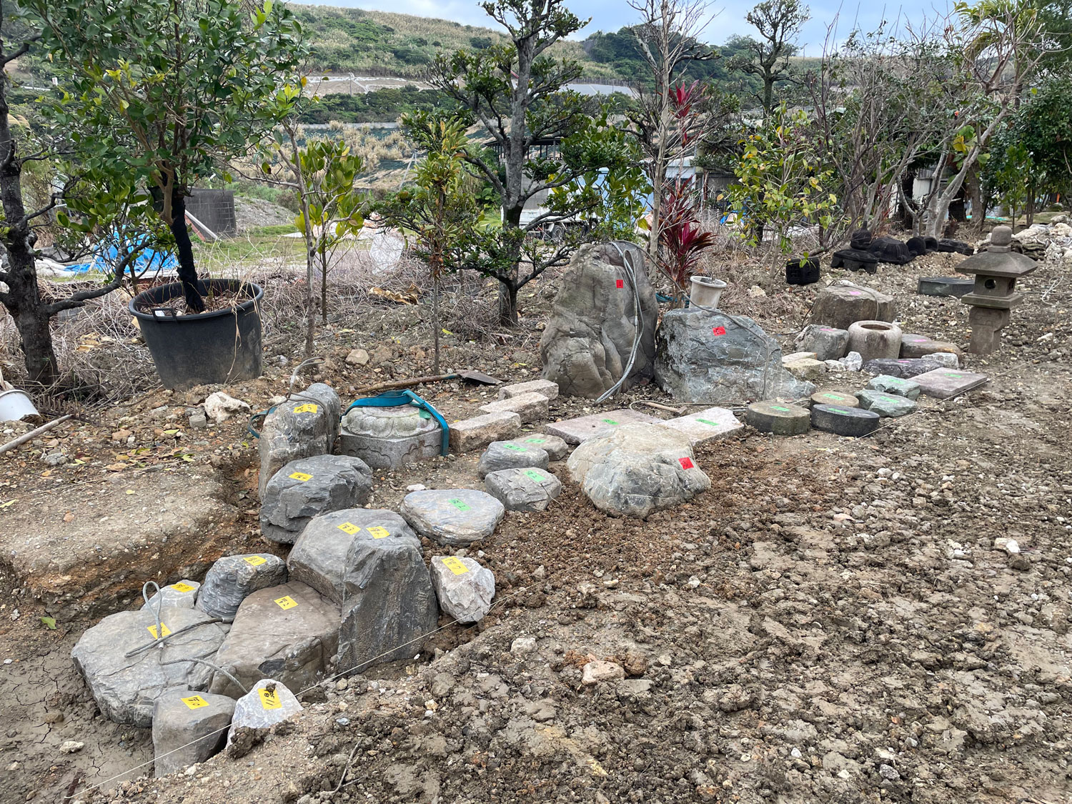 石組み、垣根、基盤工が完了したのちに、再度クレーンを設置し客土材、植栽を荷揚げ、施工しました。