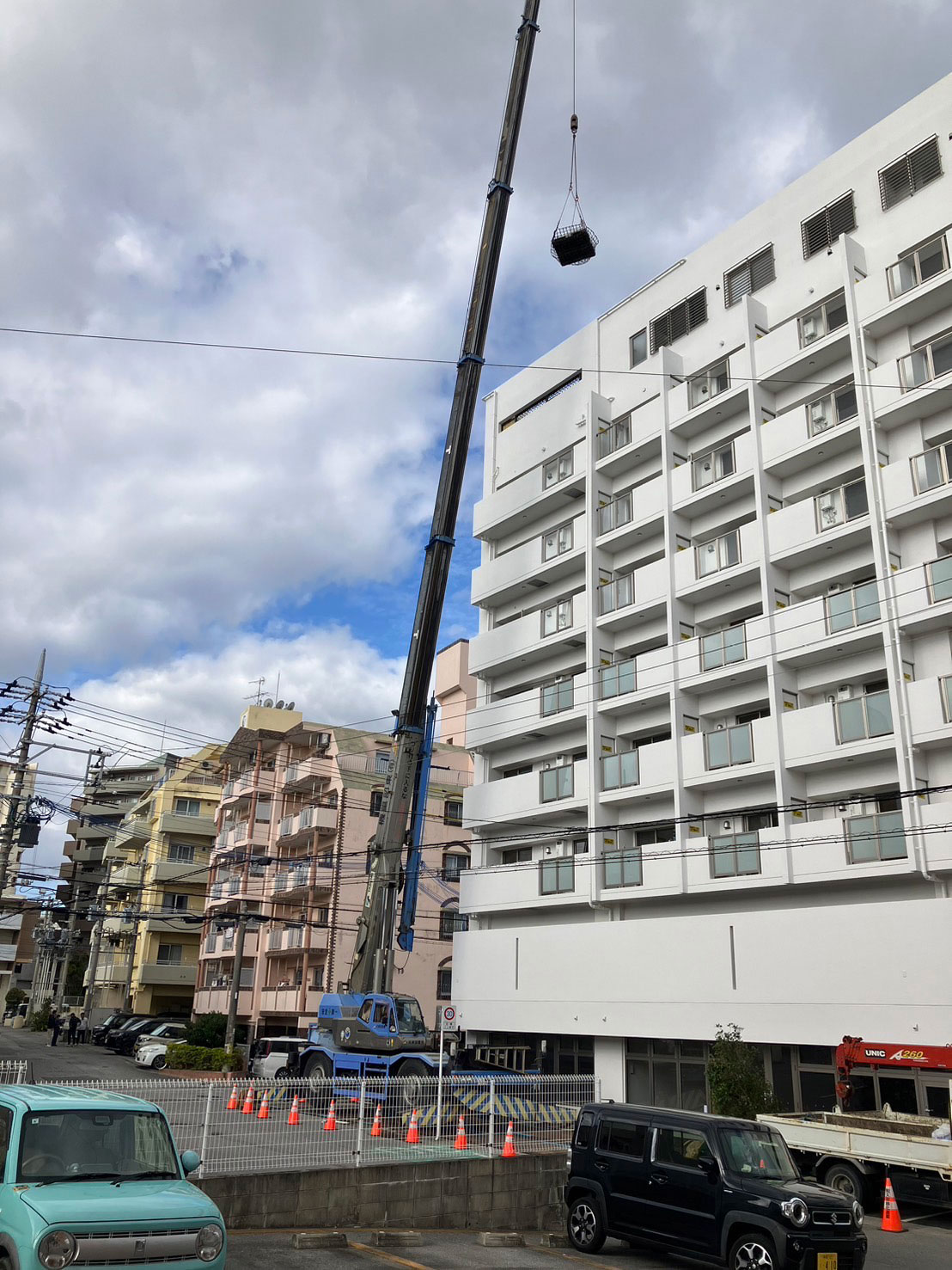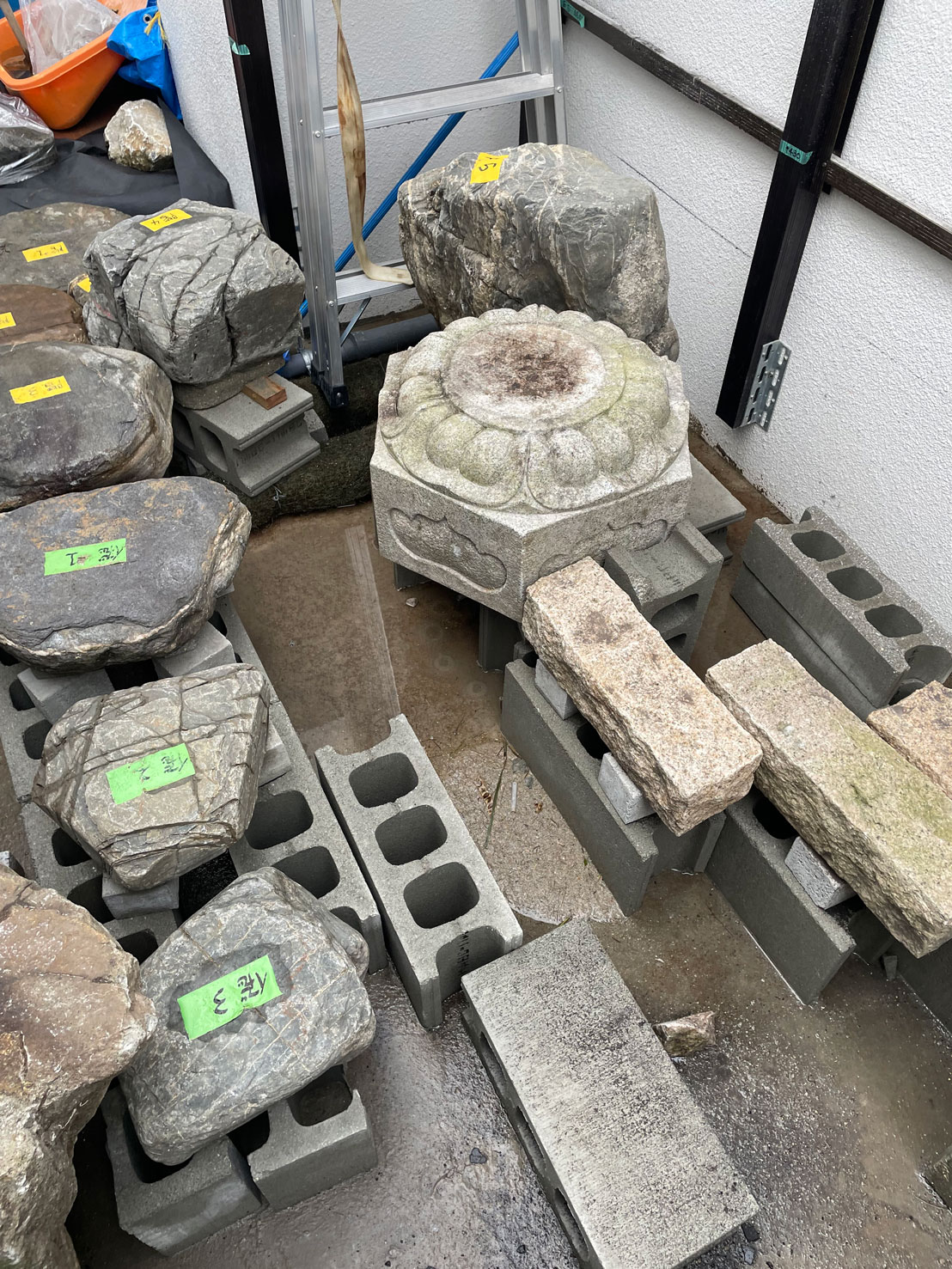 舗装を敷き鉄板で養生し、大型クレーンを設置し最初に石材と垣根の荷揚げを行い施工しました。